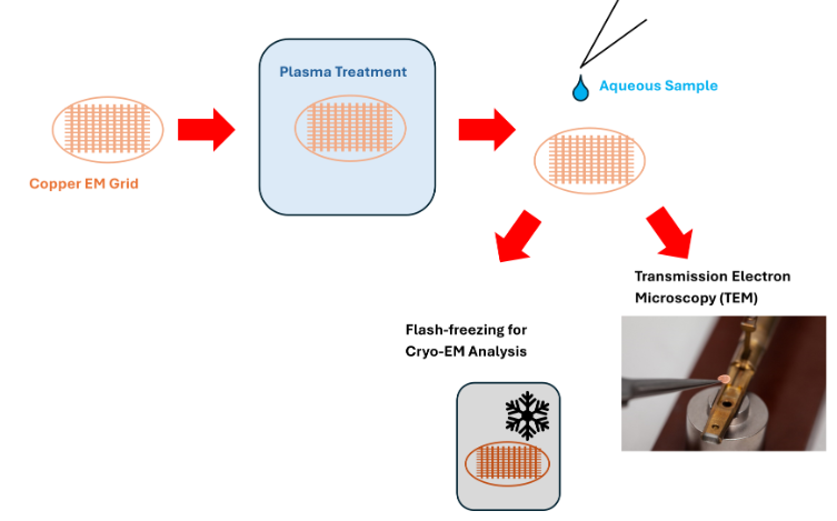 電子顕微鏡観察(TEMやクライオ電子顕微鏡:cryo-EM)でナノ粒子やペプチドを観察する前に、銅製グリッドはプラズマ処理されるのが一般的です。